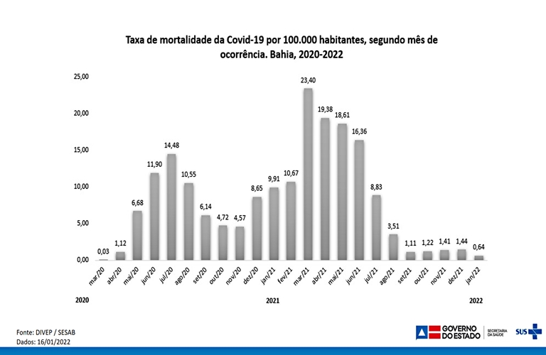 De acordo com levantamento da Diretoria de Vigilância Epidemiológica do Estado, com o avanço da vacinação na Bahia, a mortalidade teve uma queda acentuada. Em março de 2021, essa taxa era de 23,40 por 100 mil habitantes, enquanto que em dezembro caiu para 1,44 por 100 mil habitantes.