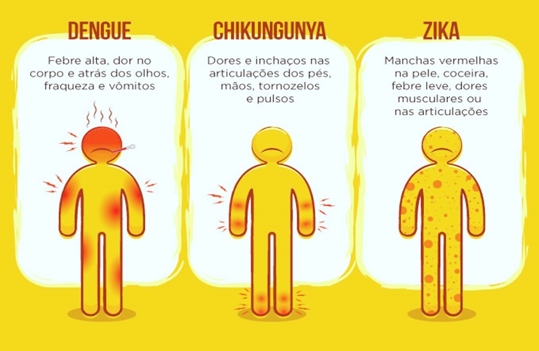 A Dengue e a Chikungunya têm sintomas e sinais parecidos, enquanto a Dengue se destaca pelas dores nos corpo, a Chikungunya se destaca por dores e inchaço nas articulações. Já a Zika se destaca por uma febre mais baixa (ou ausência de febre), muitas manchas na pele e coceira no corpo.