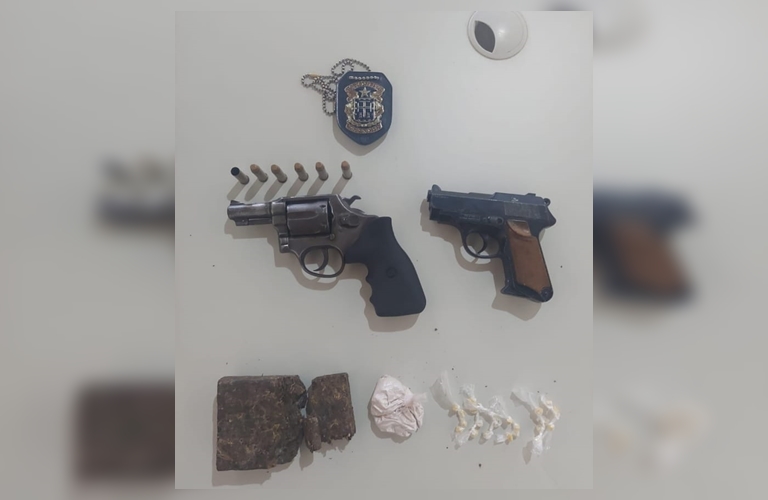 Com o suspeito os investigadores encontraram um revolver calibre 38 com seis munições, sendo uma deflagrada e cinco intactas, um pedaço pequeno de maconha, algumas pedras de crack.