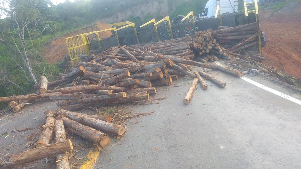 Mais um acidente é registrado durante a madrugada desta quinta-feira 02 de março de 2023, envolvendo uma carreta de eucalipto, entre Itamaraju e Teixeira de Freitas.