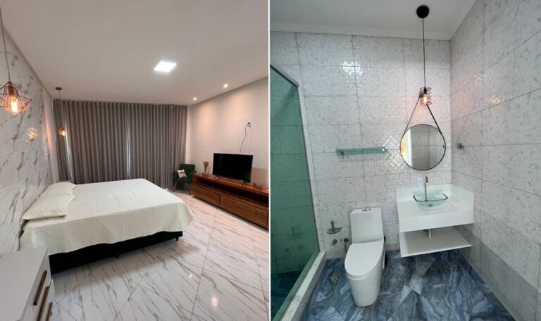 Composta de 3 apartamentos completos, com dois quartos sendo uma suíte e um banheiro social que hospeda 8 pessoas em cada andar e uma Kitchenete para 2 pessoas. Com piscina, área gourmet, ar-condicionados, Wi-Fi, 5 minutos da praia, câmeras de segurança.