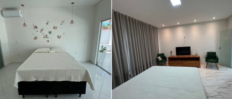 Composta de 3 apartamentos completos, com dois quartos sendo uma suíte e um banheiro social que hospeda 8 pessoas em cada andar e uma Kitchenete para 2 pessoas. Com piscina, área gourmet, ar-condicionados, Wi-Fi, 5 minutos da praia, câmeras de segurança.